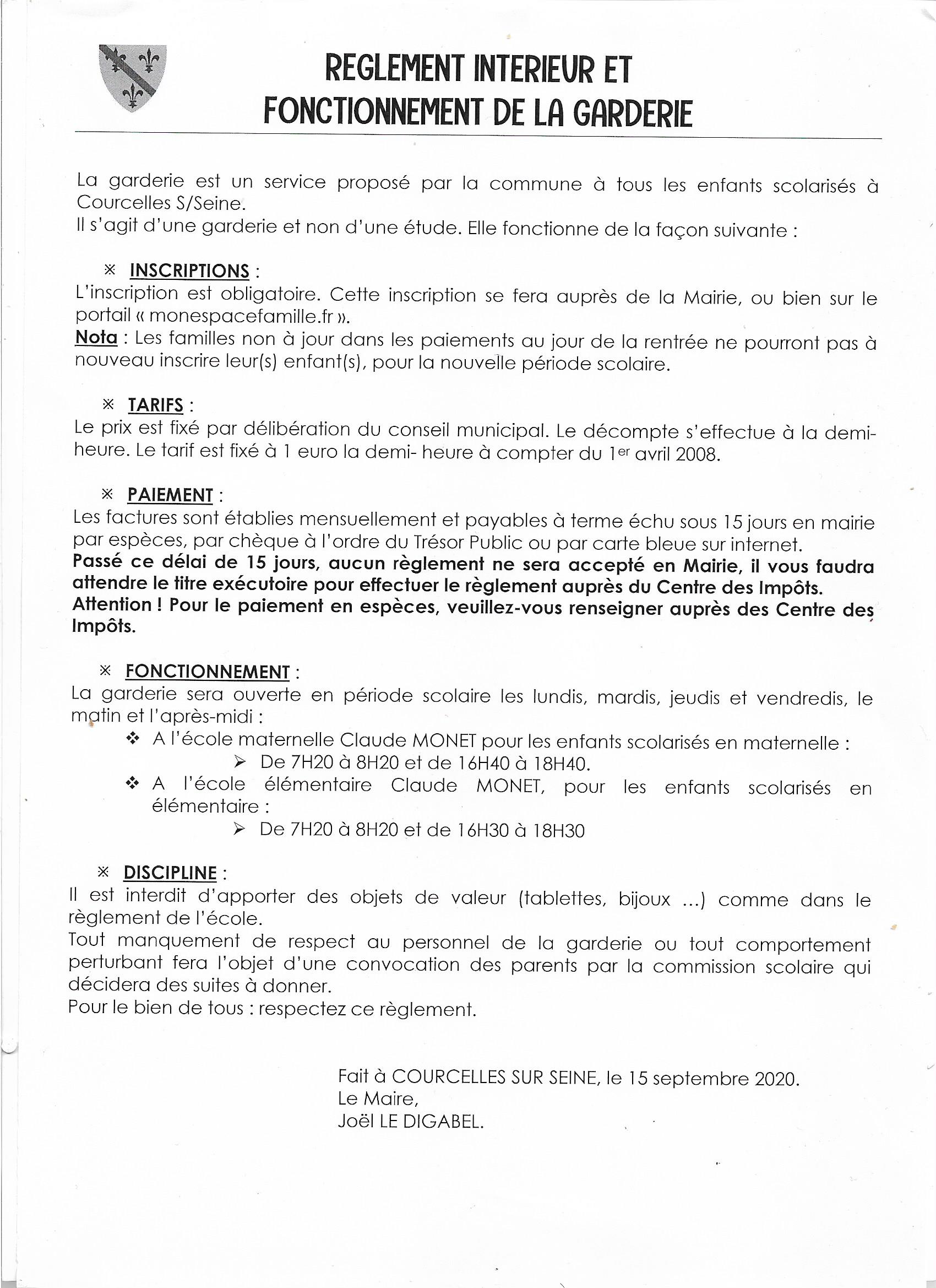 Suite à la délibération du jeudi 27 mars 2008, le conseil municipal a fixé le tarif de garderie à 1 € la demi-heure.